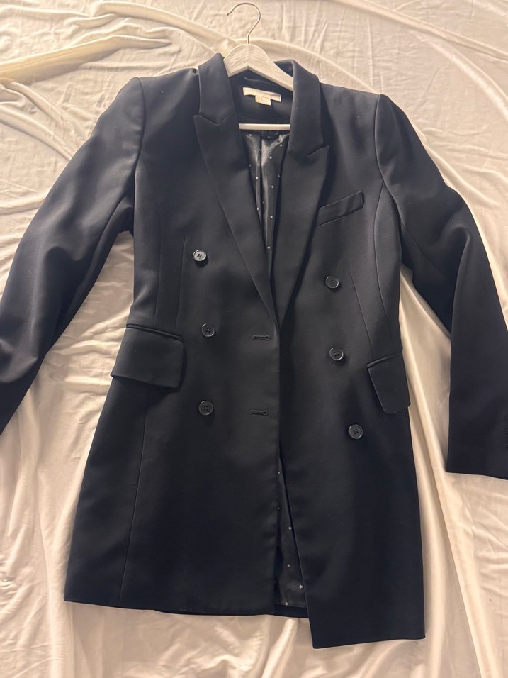 Siyah renkli, düğmeli ön kısmı ve yakası kesimli kadın blazer ceket.