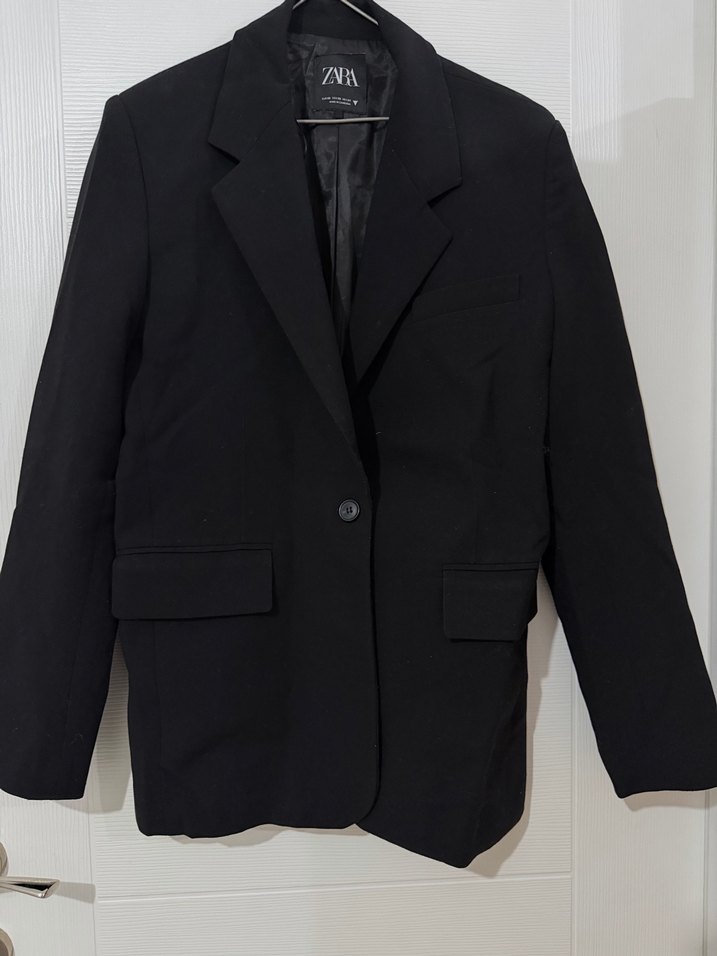 Siyah, düğmeli, notched lapel yakalı kadın blazer. Normal uzunlukta, uzun kollu, rahat kesim ve yumuşak sıcak kumaştan üretilmiştir.