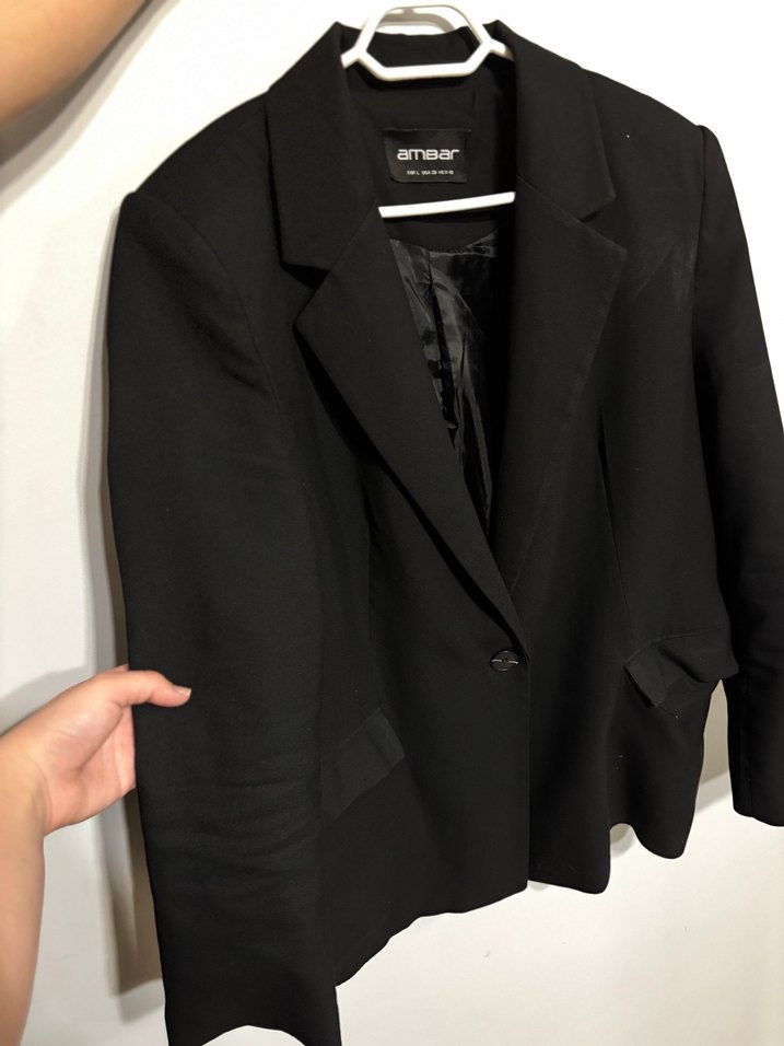Siyah, düğmeli, uzun kollu kadın blazer ceket. Normal boyda, düzenli kesim ve yakası kesikli. Ofis ve günlük tarz için uygun.