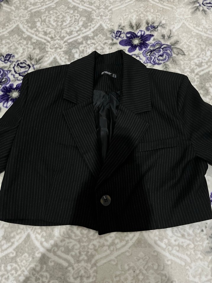 Crop Siyah renginde, kesik yakalı ve düğmeli kadın blazer ceket. Uzun kollu, normal kalıp ve sentetik kumaştan üretilmiştir, ofis kullanımı için uygundur.