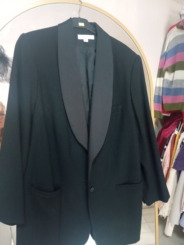 Siyah, düğmeli ve saten dokulu kumaştan yapılmış kadın blazer ceket. Normal boy, uzun kollu ve klasik kesimle ofis stiline uygundur.