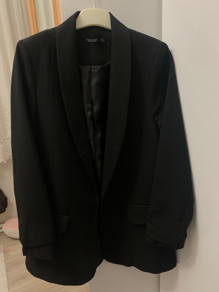 Siyah, düğmeli, uzun kollu kadın blazer ceket. Normal kesim ve ipeksi kumaşla ofis ve günlük kullanım için uygundur. Marka temsili.