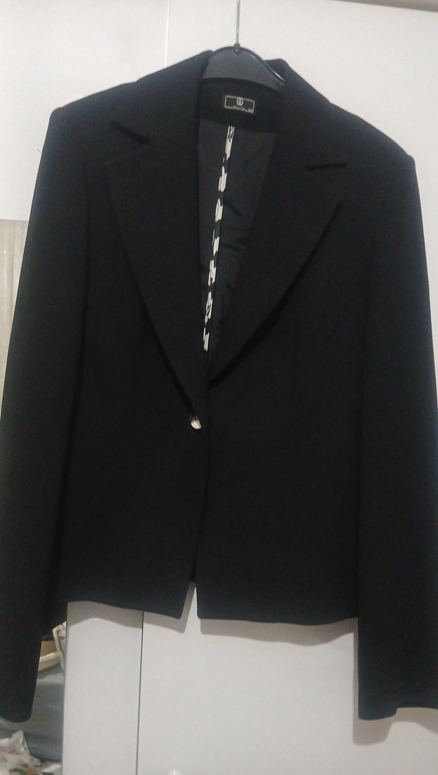 Siyah, düğmeli, uzun kollu kadın blazer ceket. Normal midi boyda, notched yakalı ve regular fit. Ofis ve klasik goth tarzı için uygun.