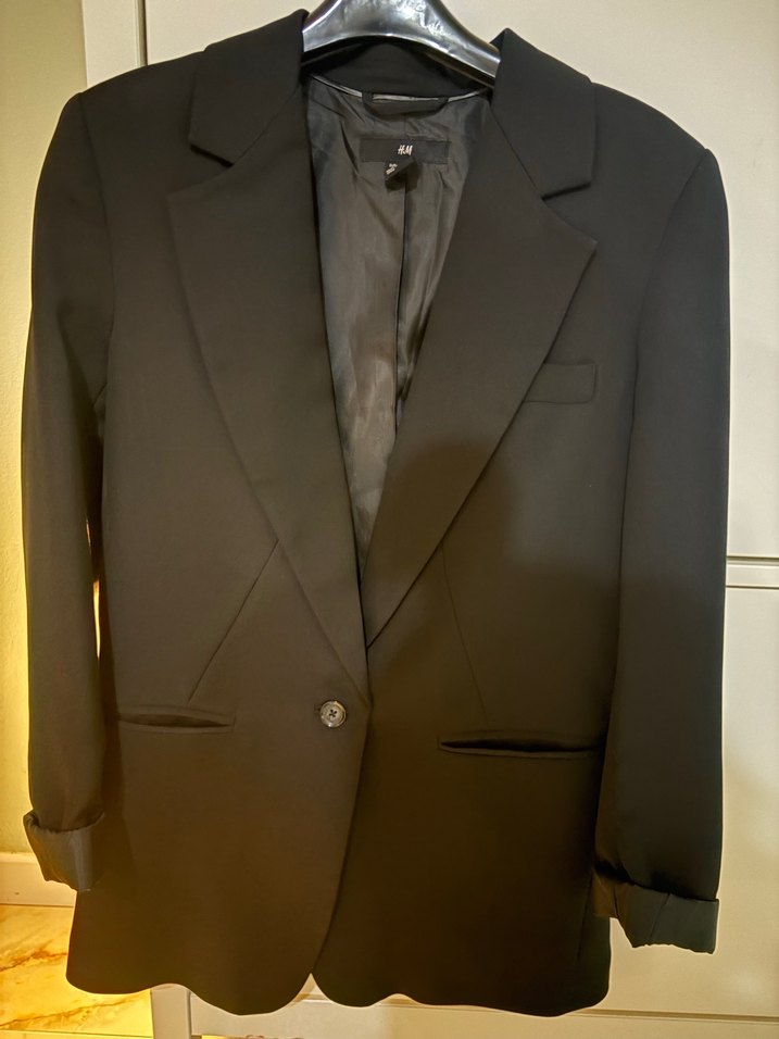 Siyah, düğmeli, satenimsi kumaştan yapılmış, kesik yaka ve uzun kollu kadın blazer ceket. Ofis kullanımı için midi uzunlukta ve slim fit