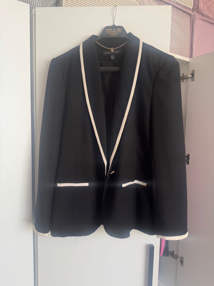 Siyah, düğmeli, yakalı kadın blazer ceket. İpek gibi kumaş ve askılı kollarla modern klasik tarzda, ofis için uygun midi boy. Klasik kesim bir ceket. M bedene de uygun. Herhangi bir defosu yok. Dugmesi orjinal dugmesidir.
