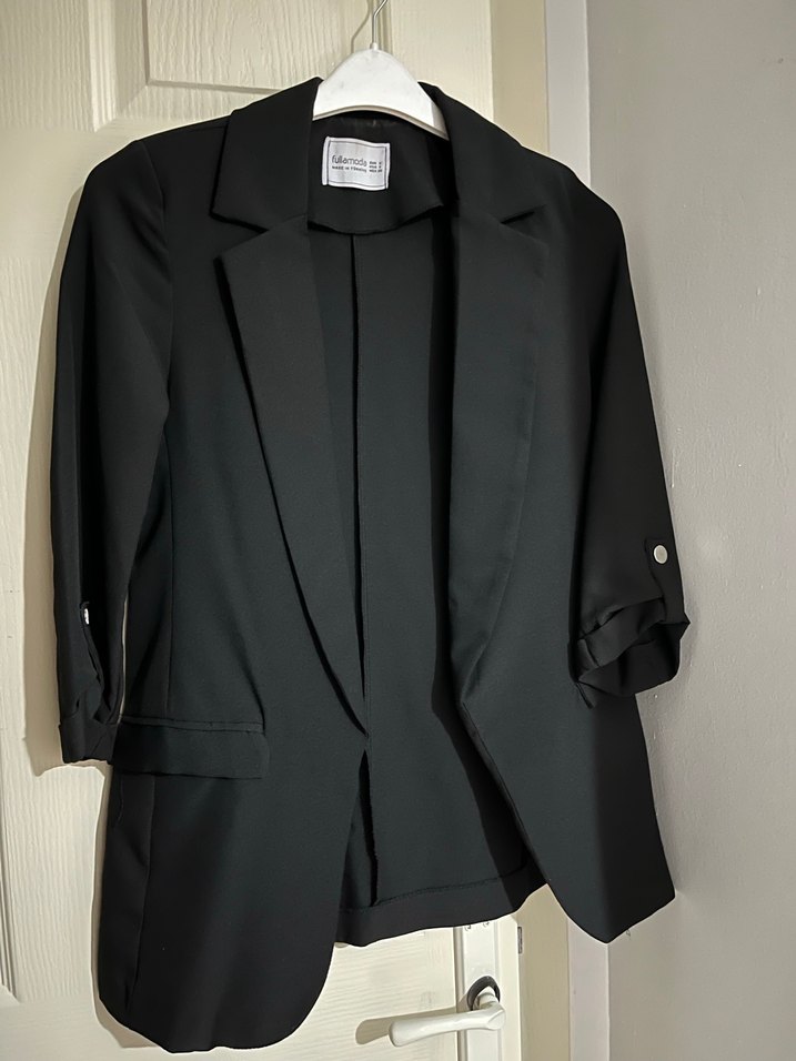 Siyah renkli, düğmeli ve kesimli yakalı kadın blazer ceket, yarım kollu ve normal boyda. iş ve günlük kullanıma uygundur.