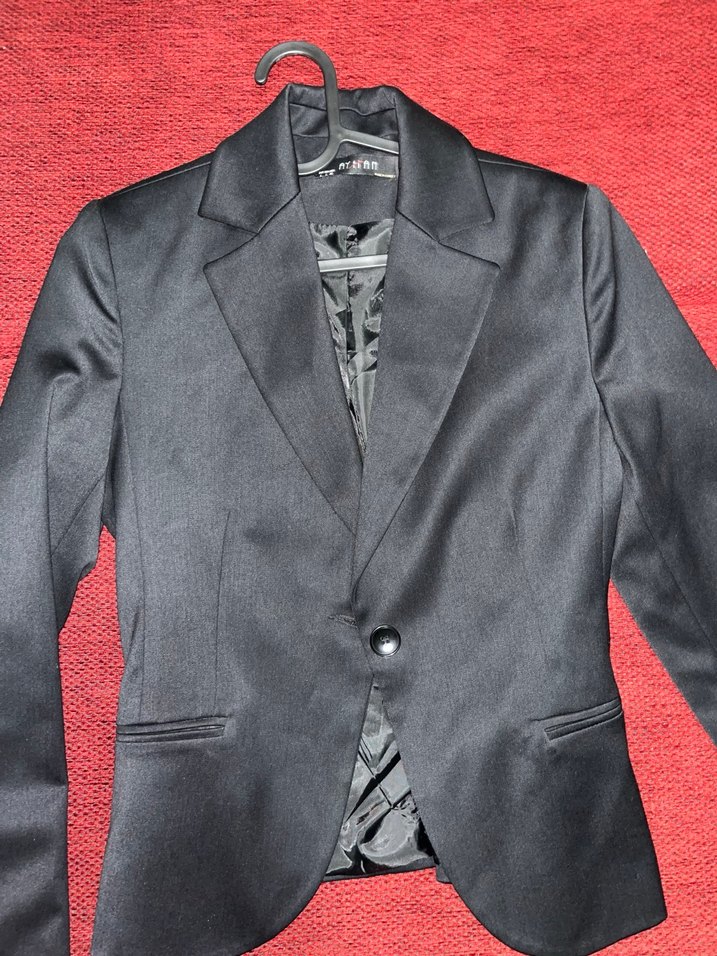 Siyah kadın blazer, keskin yaka ve düğmeli kapama ile. Uzun kollu, normal kesim ve yumuşak sentetik kumaştan, ofis için uygun.