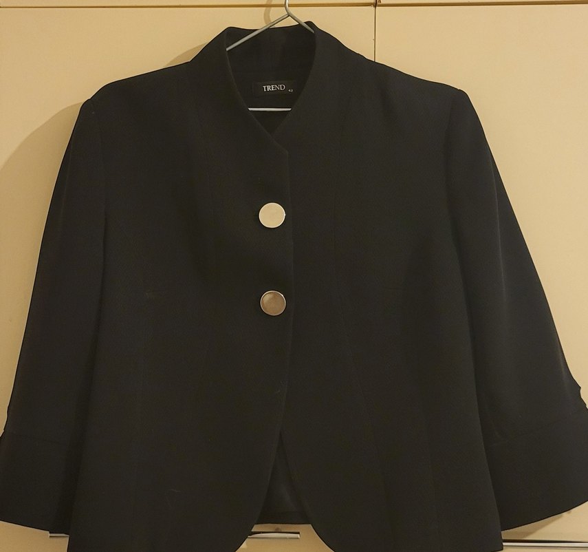 Şık siyah, düğmeli kadın blazer ceket, ipeksi kumaştan ve normal midi boyda. Ofis için uygun, klasik, desen içermeyen tasarım.