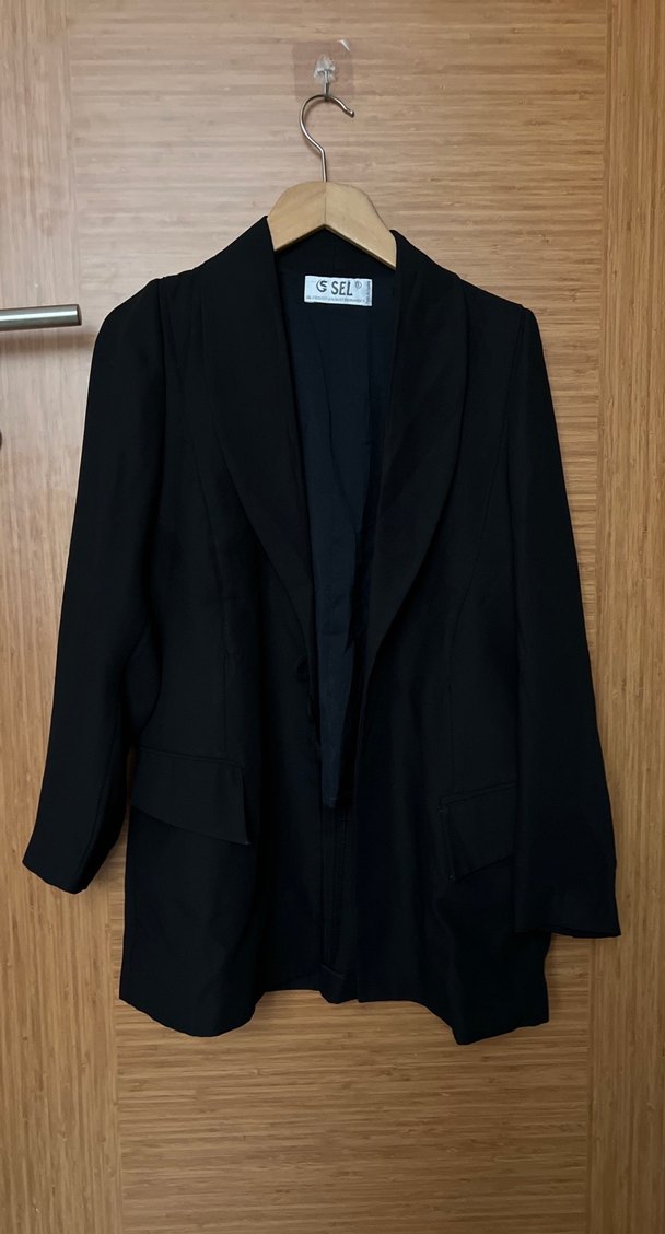 Siyah, düğmeli, normal kesim kadın blazer ceket, ipeksi kumaştan, uzun kollu, notched lapel yaka ile ofis için uygundur.