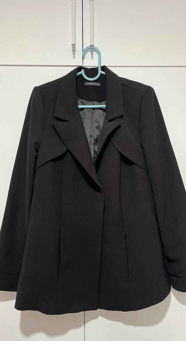 Siyah renkli, düğmeli, uzun kollu kadın blazer ceket. Notlu yakalı, normal midi boyda ve sentetik kumaştan yapılmıştır. Ofis ve gündelik goth tarzı için uygundur.