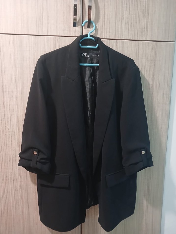 Siyah kadın blazer ceket, düğmeli ve uzun kolludur. Normal kesim ve midi boyda, ofis ve günlük kullanıma uygundur.