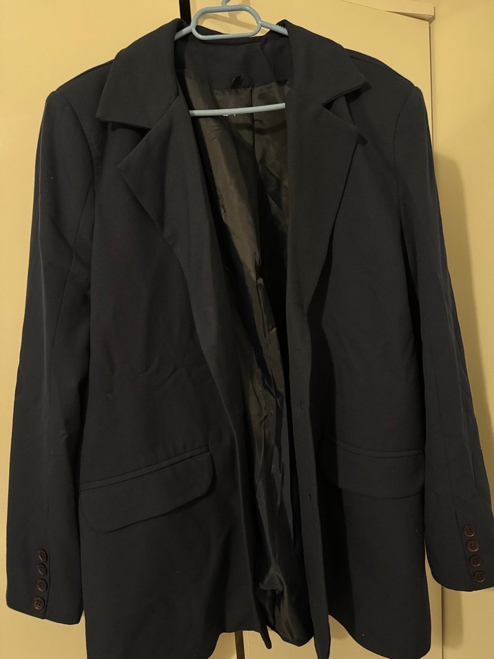 Siyah, düğmeli kadın blazer ceket, kesik yaka ve uzun kolludur. İpeksi kumaştan yapılmış, ofis ve günlük kullanıma uygundur.