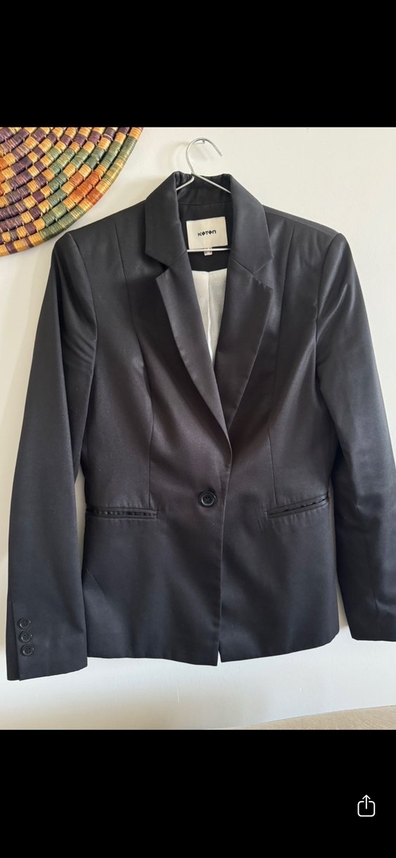 Kadın blazer, keskin yaka ve tek düğmeli kapanışa sahiptir. Normal kesim, uzun kollu ve ipeksi dokuludur. Ofis için uygun, siyah ve desensiz midi uzunluktadır.
