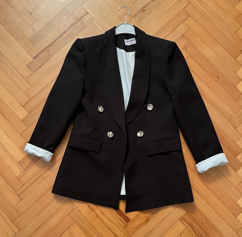 Siyah renkli, düğmeli, yakalı kadın blazer ceket. Orta boy, regular fit ve askılı kollu, ipeksi dokuda, klasik ve desen içermeyen tasarım ofis için uygun.