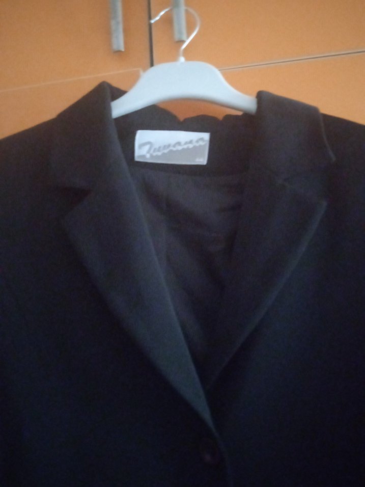 Siyah, düğmeli, ipeksi kumaştan yapılmış kadın blazer ceket, klasik yakalı ve uzun kollu, ofis kullanımı için uygun.