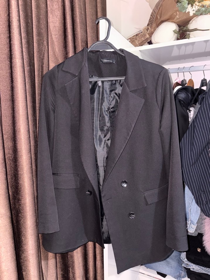 Siyah, düğmeli kadın blazer ceket, kesik yaka ve uzun kollu, sentetik kumaştan, regular fit. Ofis kullanımı için uygundur.