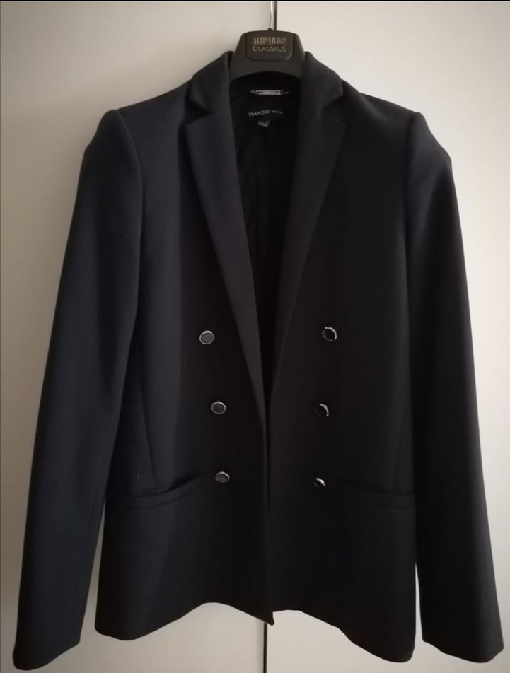 Siyah, düğmeli, normal kesim ve uzun kollu kadın blazer ceket. Satenimsi kumaştan, ofis kullanımı için uygundur.