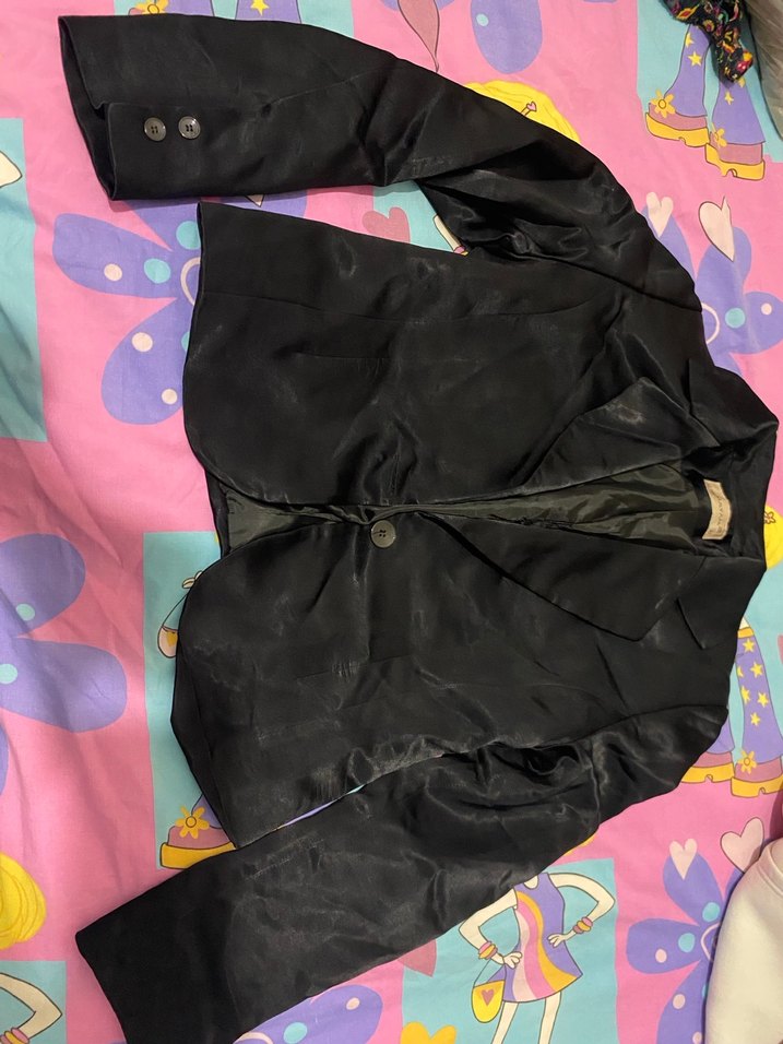 Siyah, düğmeli, saten görünümlü, uzun kollu, normal midi boyda, kesimi vücuda oturan kadın blazer ceket. Avant-garde parti stilleri için uygundur.
