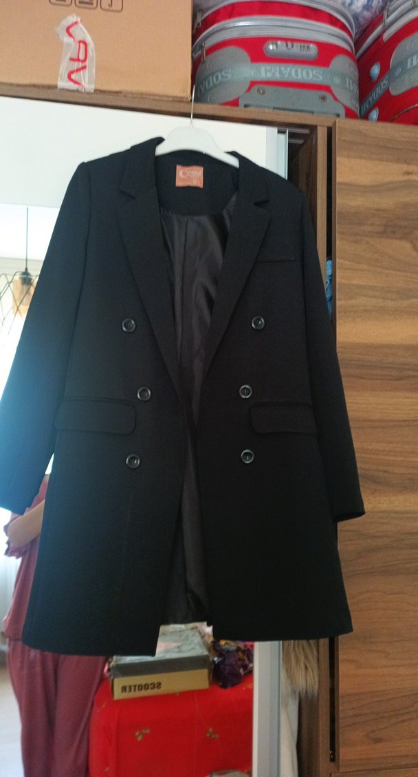 Siyah kadın blazer, kesimli yaka, düğmeli ön ve uzun kolludur. Regular fit ve midi boydadır, yumuşak sentetik kumaştan üretilmiştir, ofis ve sokak stili için uygundur.