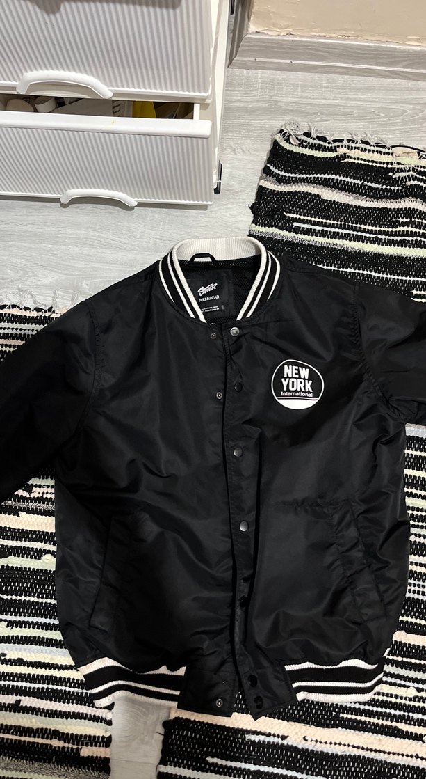 Uzun kollu, düğmeli, bol kesim siyah bomber ceket. Sentetik kumaştan, baskılı New York detayı ile günlük kullanıma uygun.