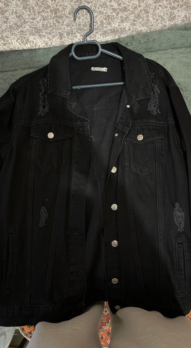 Siyah renk, düğmeli ve yıpranmış detaylara sahip bol kesim denim ceket. Notched lapel yakalı, günlük kullanıma uygun sokak stili.