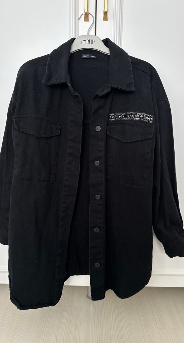 Düğmeli, uzun kollu, bol kesim siyah denim ceket. Çentikli yaka ve cep detaylarıyla sokak stiline uygun.