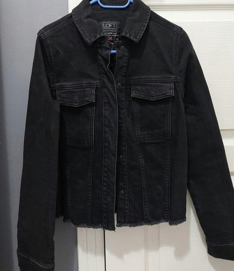 Siyah, düğmeli, uzun kollu ve çentikli yaka detaylı, dar kesim kadın denim ceket. Sokak stiline uygun, iki göğüs cep ve ham kenar detaylıdır.