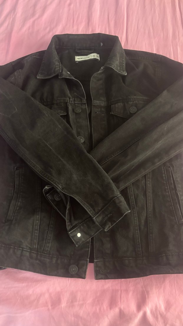 Bu siyah denim ceket düğmeli ön, kesik yaka ve uzun kolludur. Rahat ve bol kesimiyle günlük sokak stiline uygundur.