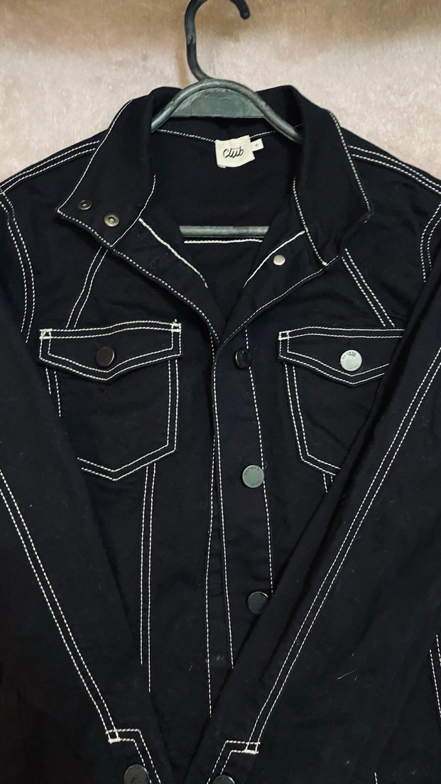 Siyah renkli, düğmeli kadın denim ceket. Notlu yaka, uzun kollu, normal boyda ve rahat kesim. Günlük sokak stiline uygun, beyaz dikiş detaylı.