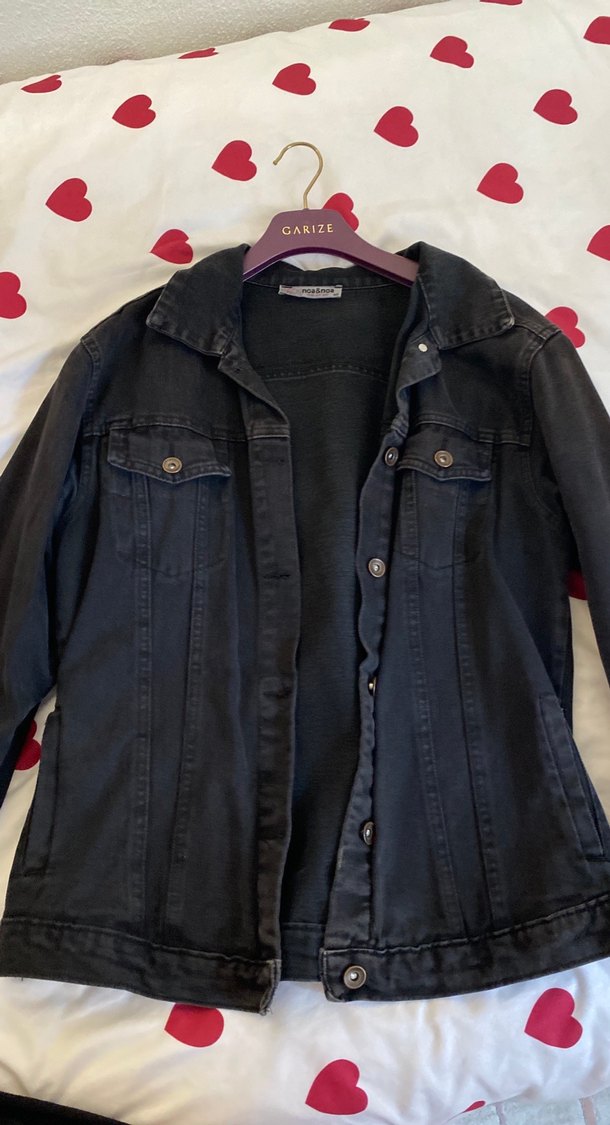 CARIZE marka siyah denim ceket, düğmeli ön, kesik yakalı ve uzun kolludur. Bol kesim ve normal midi boydadır, günlük rahat stil için uygundur.