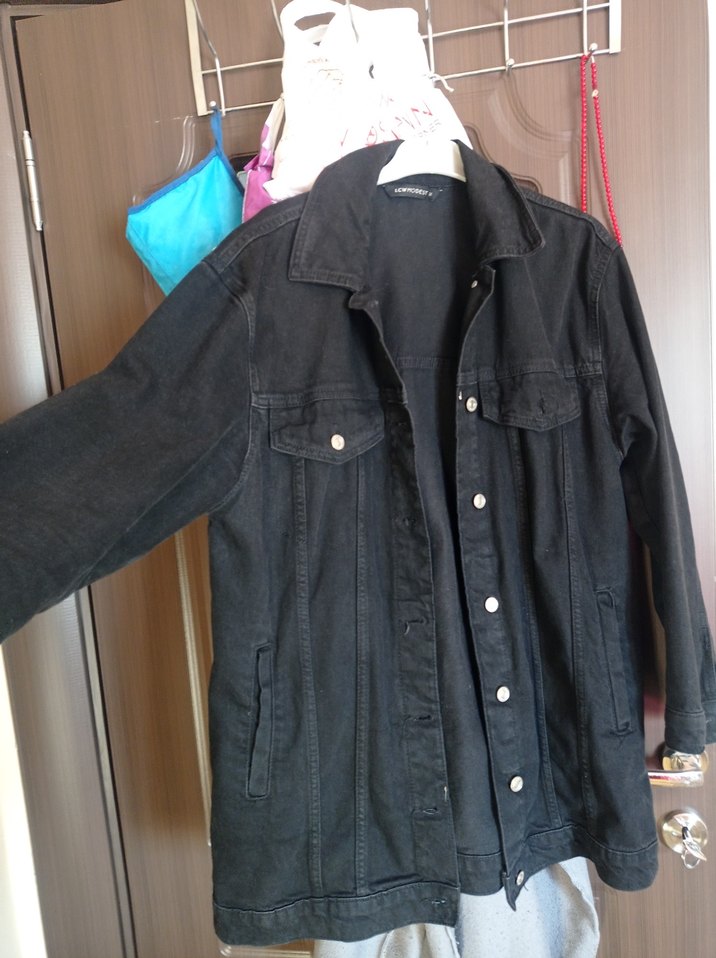 Uzun kollu, düğmeli ve siyah renkte, bol kesim kadın denim ceket. Günlük rahat kullanım için uygundur.