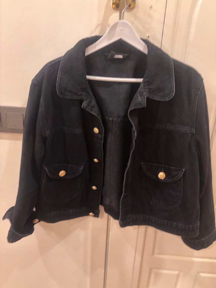 Bu siyah denim ceket, düğmeli kapamalı, uzun kollu ve notched yakalıdır. Rahat kesimi ve cep detaylarıyla günlük kullanıma uygundur.