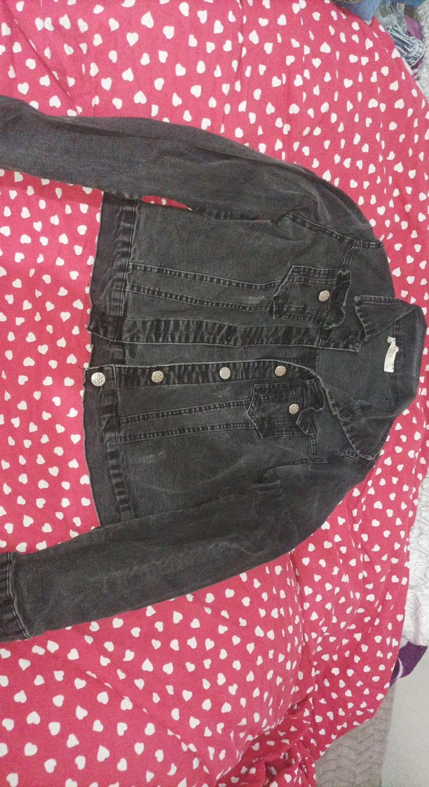 Siyah renkli, düğmeli ve uzun kollu kadın denim ceket. Oturmuş kesimi ve yakası ile gündelik sokak stili için uygundur.