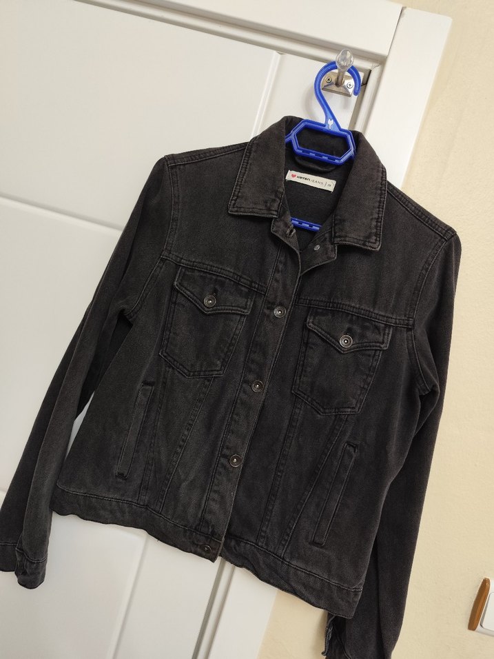 Siyah renkli, uzun kollu, düğmeli, bol kesim kadın denim ceket. Notlu yaka ve iki göğüs cebine sahip, günlük sokak stili için uygun.