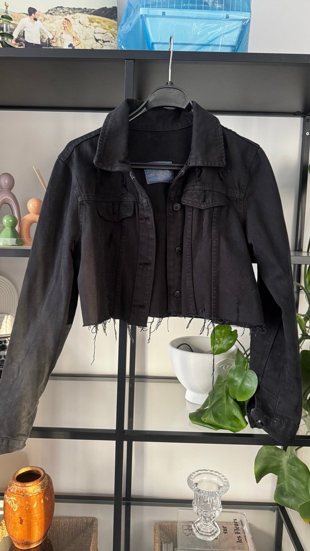 Bu siyah, düğmeli ve fitted kesim denim ceket, uzun kollu ve yakası notched lapel şeklindedir. Kısa boyu ve ham kenarlarıyla gündelik goth tarzını yansıtır.