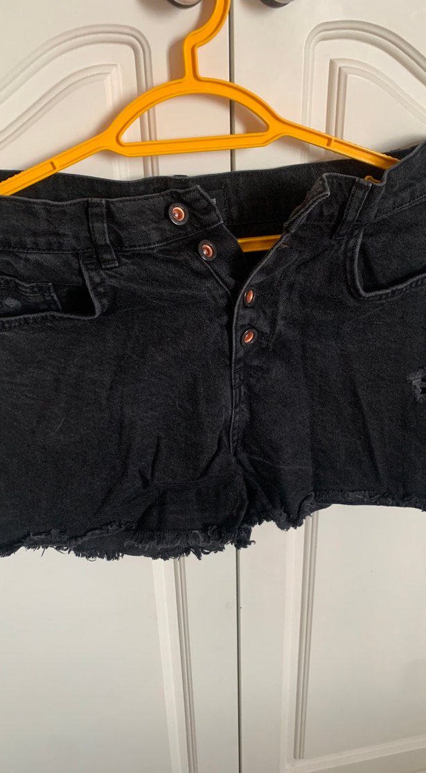 Siyah düğmeli ön kısmı ve bol kesimiyle midi denim şort, uç kısmı tırtıklı, grunge punk tarzında. Günlük sokak giyimine uygun.