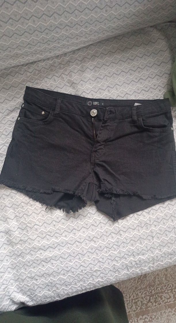 Düğmeli, salaş kesim siyah denim mini şort. Uçları hafif yırtık detaylı, günlük sokak stiline uygun rahat bir parça.
