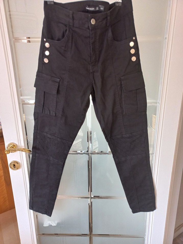 Siyah denim kumaştan, düğmeli ve cep detaylı, bol kesim midi uzunlukta kadın pantolonu. Günlük sokak stiline uygun. boyu 98 cm beli 40 cm