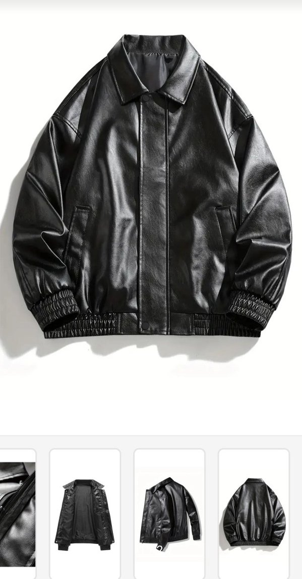 Siyah deri ceket, düğmeli ve bol kesimdir. Uzun kollu, yakası kesik ve elastik manşetlidir. Minimalist, günlük kullanım için uygundur.