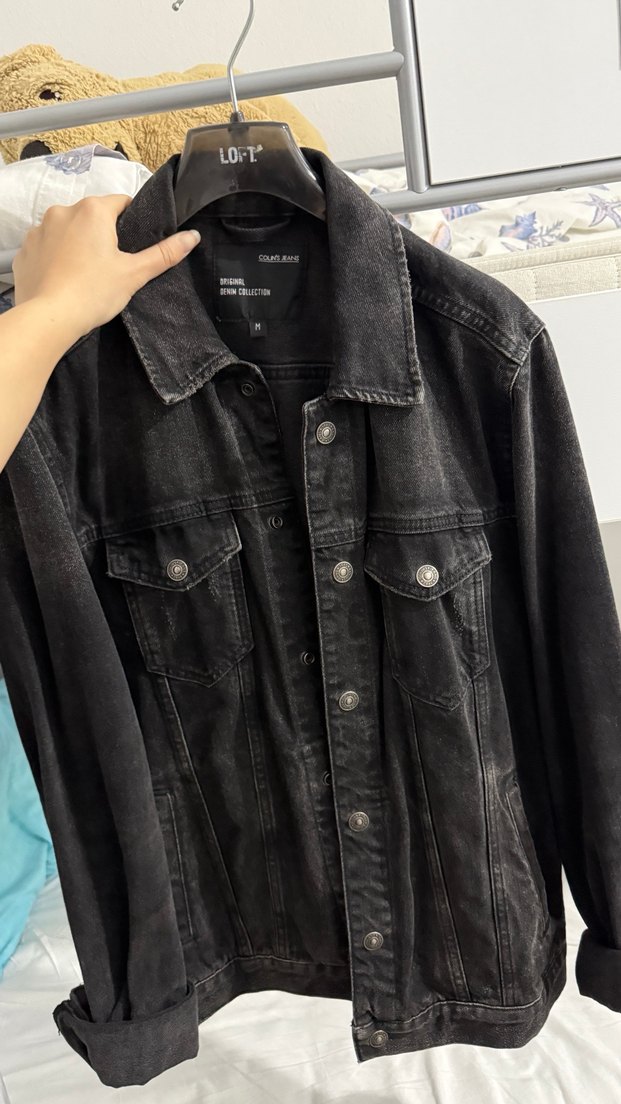 Siyah renk, düğmeli ön kısmı ve çıtmalı cepleri olan, bol kesim kadın denim ceket. Uzun kollu ve normal midi boyunda, gündelik kullanım için uygundur.
