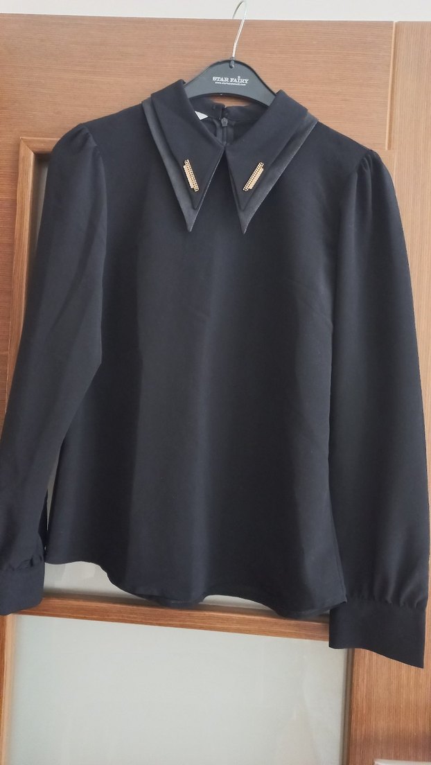 Siyah, uzun kollu, yakalı ve düğmeli kadın gömleği. Ofis kullanımı için uygun, trend goth tarzında, sentetik kumaştan.
