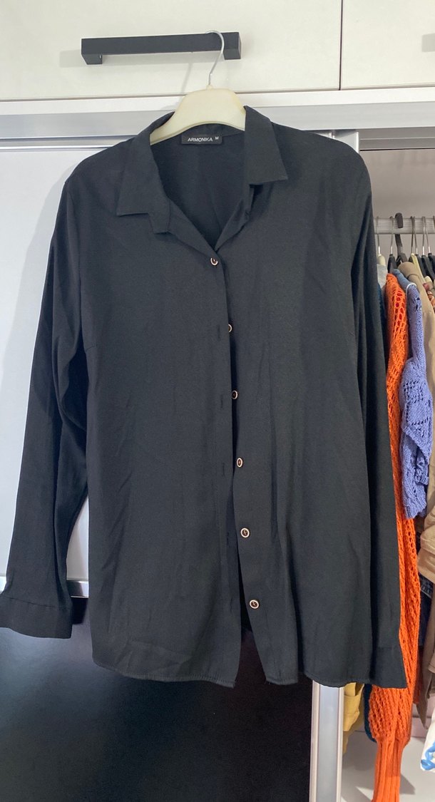 Siyah, düğmeli, notalı yaka, uzun kollu, midi boy ve bol kesim kadın gömleği. İpeksi kumaştan üretilmiştir, günlük rahat sokak stiline uygundur.