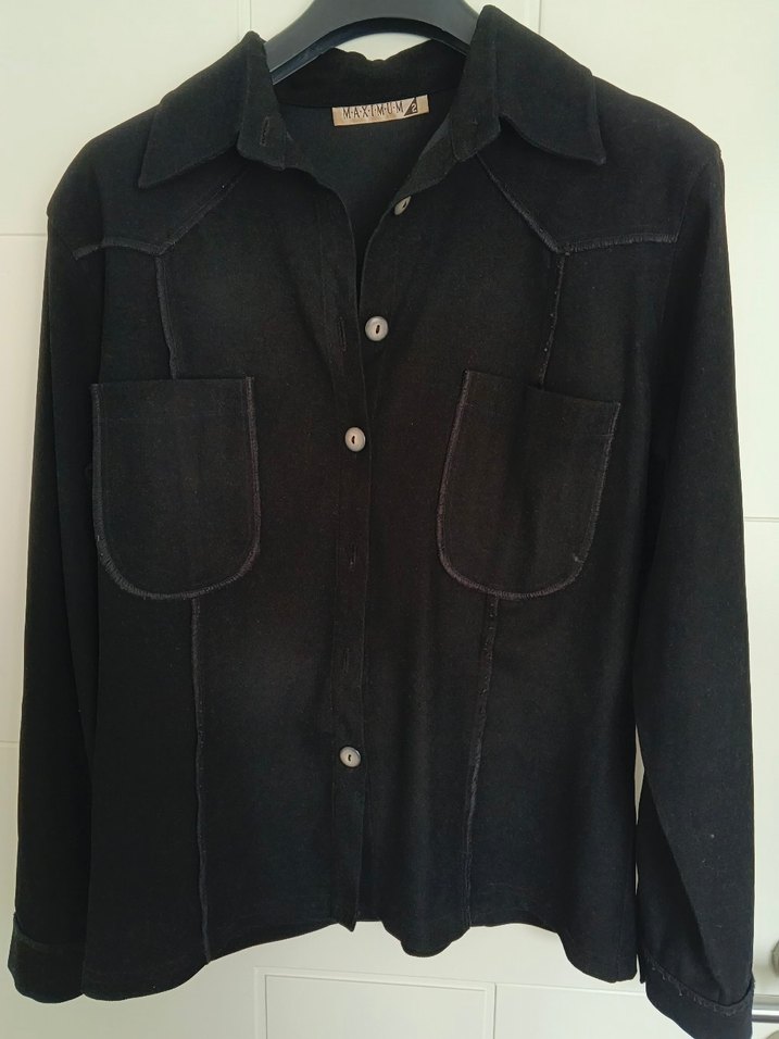 Siyah kalın kumaştan, düğmeli, kesik yakalı ve uzun kollu kadın gömleği. Normal kesim ve iki ön cep detayına sahip gömlek çok az kullanıldı.