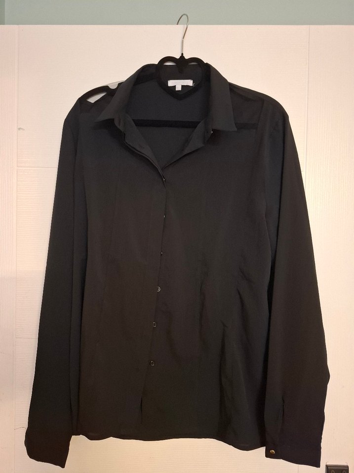 Siyah, düğmeli, uzun kollu, yakalı kadın gömleği. Rahat kesim, minimalist ve gotik tarzda, ofis kullanımı için uygun. Pürüzsüz sentetik kumaştan yapılmıştır.