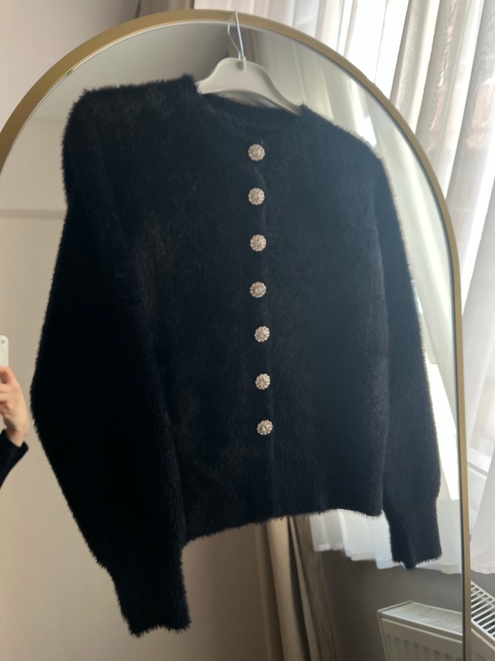 Siyah, düğmeli, yuvarlak yaka ve uzun kollu örme kadın hırkası. Rahat ve bol kesimiyle gündelik kullanıma uygun, gotik tarzda bir parça.