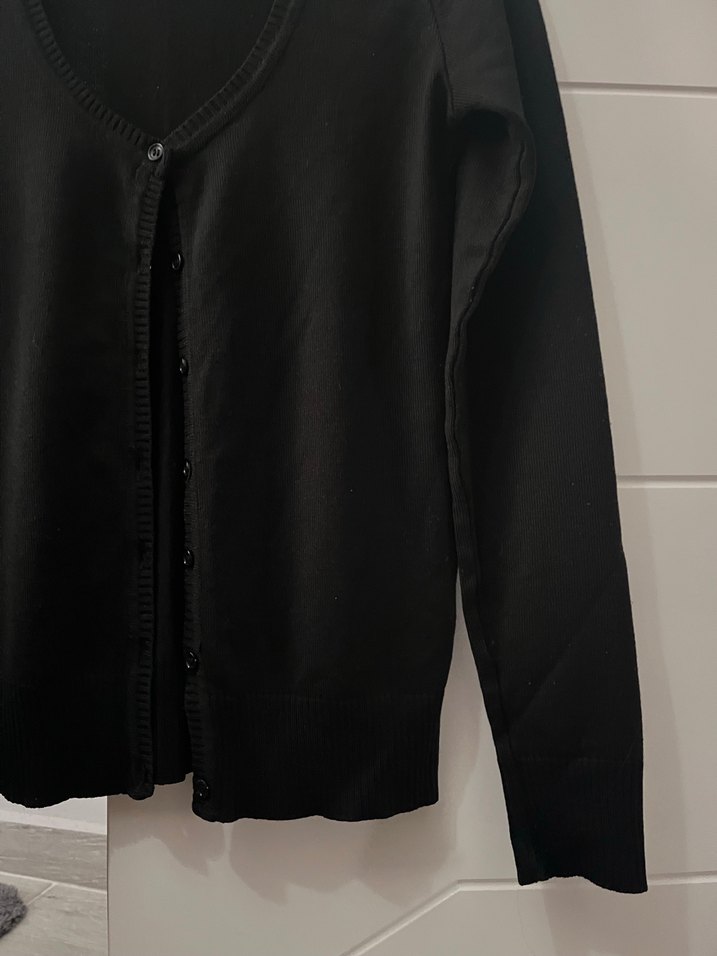 Siyah, düğmeli, uzun kollu, yuvarlak yakalı, dar kesim kadın hırkası. Minimalist goth tarzında, günlük kullanım için uygundur.