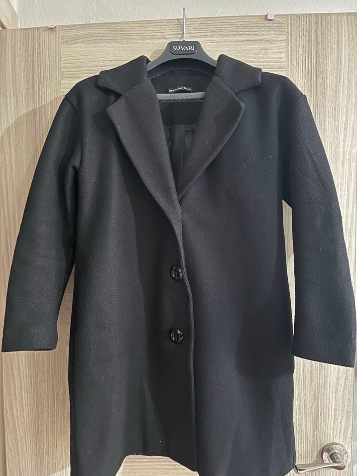 Siyah, klasik yaka ve iki düğmeli kadın kabanı, soğuk havalar için yumuşak ve sıcak kumaştan yapılmıştır.