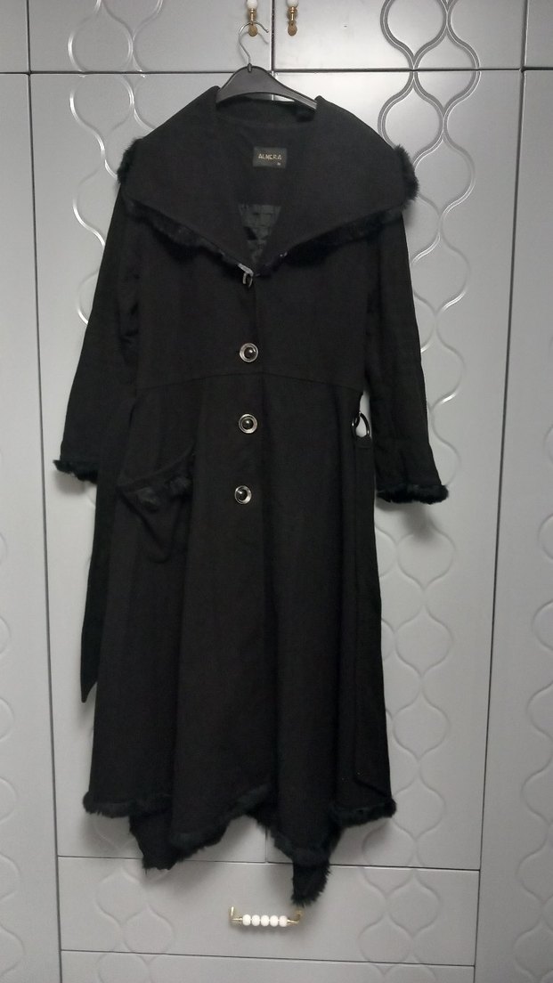 Geniş yakalı, düğmeli ve yumuşak detaylı siyah uzun kadın kabanı.