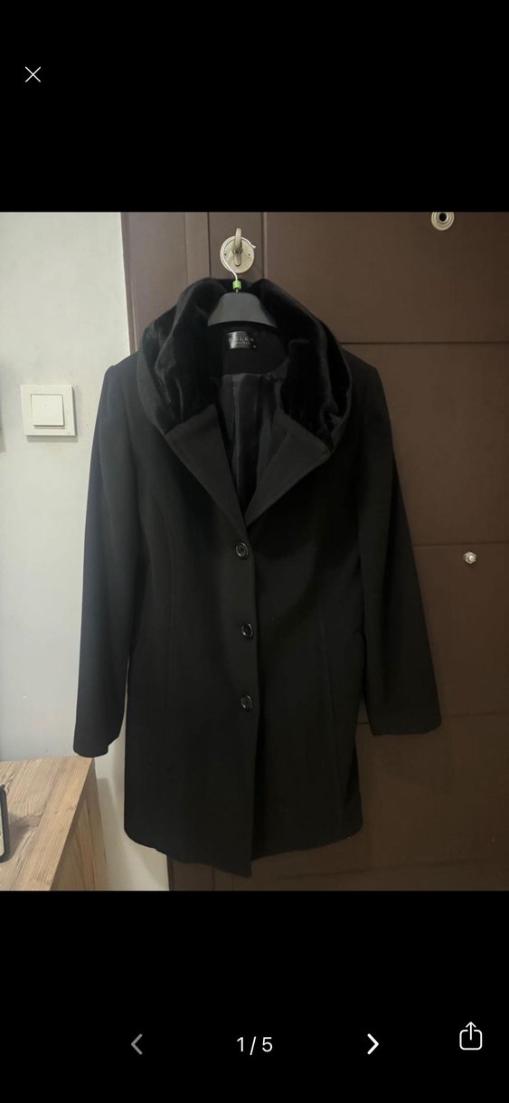Siyah renkli, düğmeli ve yumuşak, sıcak yakaya sahip kadın kabanı. Klasik kesim ve uzun kolludur. 1 kere giyilmiştir temizlemesi yapılmış duruyor. #kaban #kadınkaban #kürkyaka