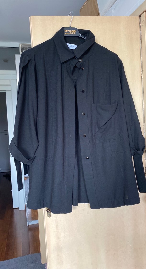 Siyah keten gömlek, notlu yakalı ve uzun kolludur. Düğmeli, cep detaylı, midi boy ve bol kesimdir. Ofis için Paris tarzı normcore şıklığı sunar.